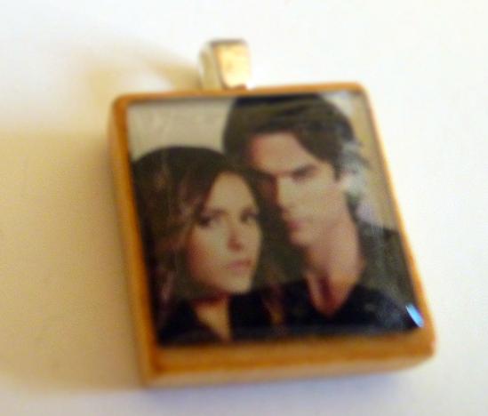 Damon and Elena "Delena" Scrabble tile pendant with a silver hook. Pendant only, no chain.